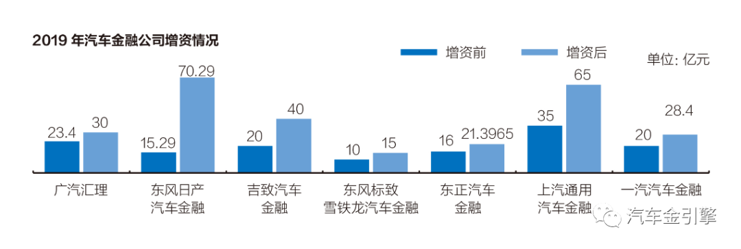 2019年,汽车金融公司持续增资以补充资本,满足业务扩张需求。据公开资料显示,2019年,包含上汽通用汽车金融、广汽汇理汽车金融、吉致汽车金融等在内的7家汽车金融公司合计获批增资130.3965亿元。