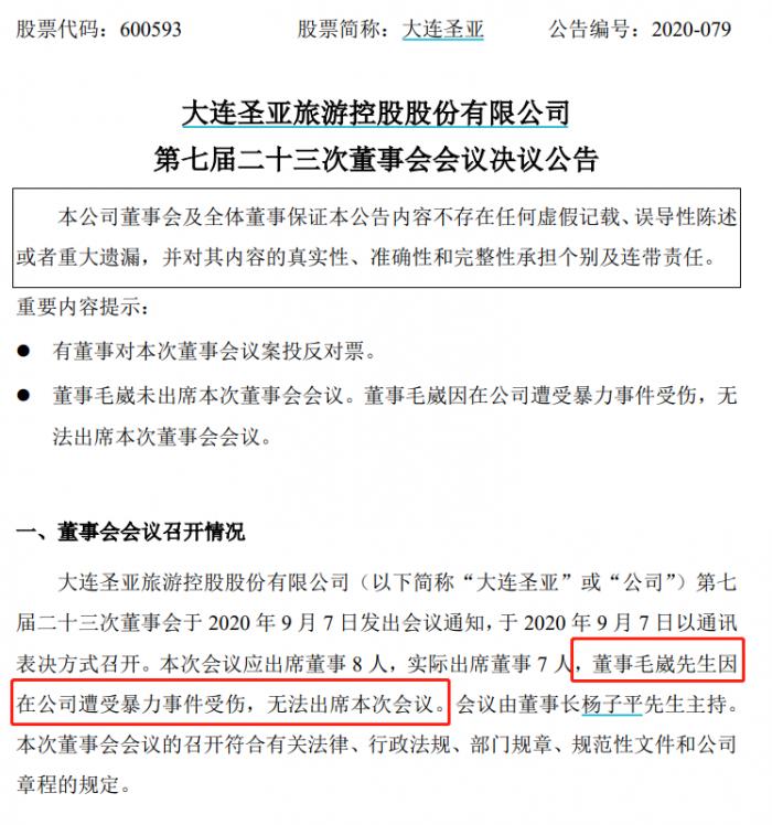 消息面上,9月7日晚间,大连圣亚发布公告称,大连圣亚旅游控股股份有限公司第七届二十三次董事会于2020年9月7日发出会议通知,于2020年9月7日以通讯表决方式召开。本次会议应出席董事8人,实际出席董事7人,董事毛崴先生因在公司遭受暴力事件受伤,无法出席本次会议。