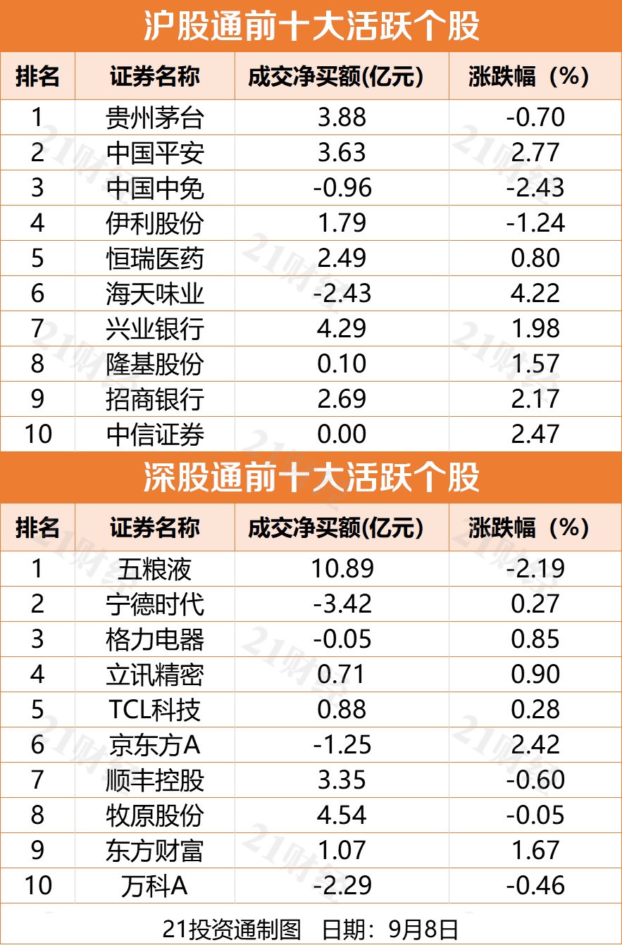 个股方面,五粮液(000858.SZ)、牧原股份(002714.SZ)、兴业银行(601166.SH)净买入居前,分别获净买入10.89亿元、4.54亿元、4.29亿元;宁德时代(300750.SZ)、海天味业(603288.SH)、万科A(000002.SZ)则分别被净卖出3.42亿元、2.43亿元、2.29亿元。