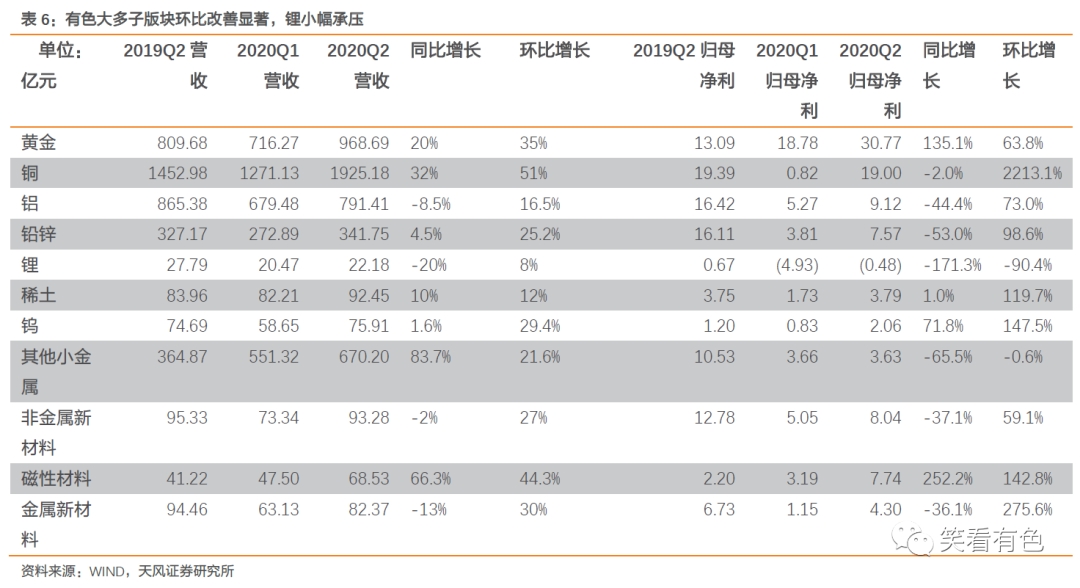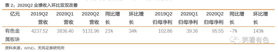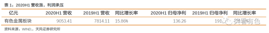 2020年H1有色金属板块利润承压,Q2环比大幅修复