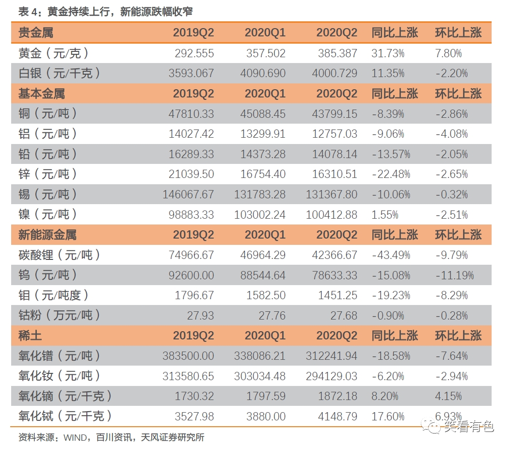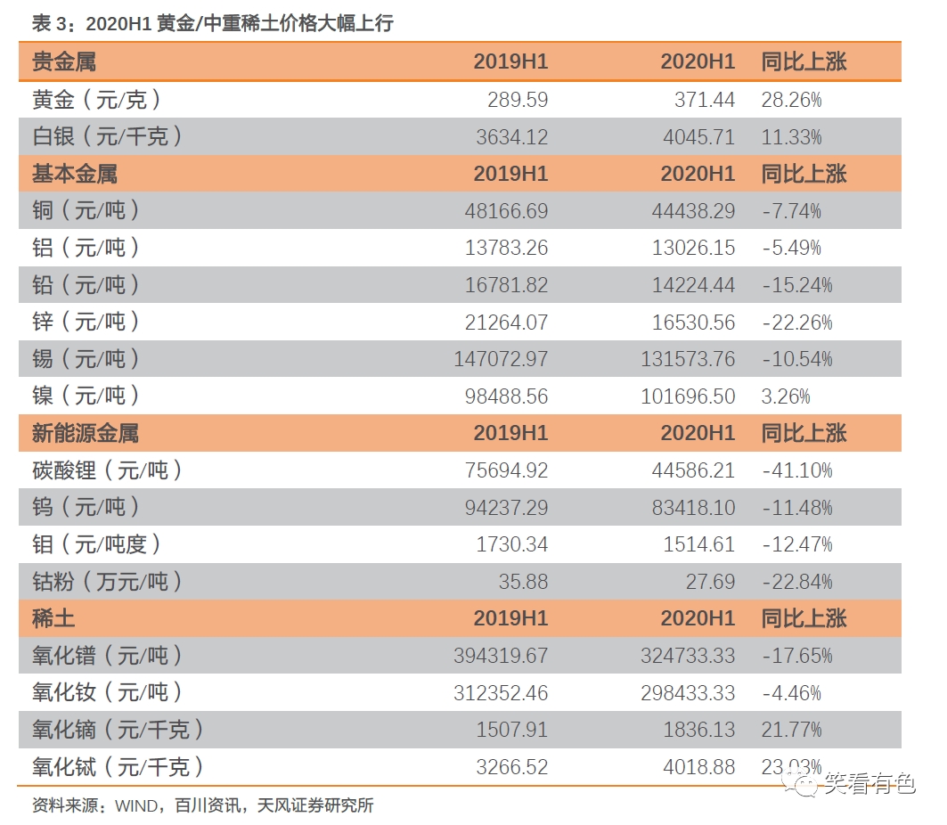 2.1. 2020H1贵金属与中重稀土价格涨幅显著