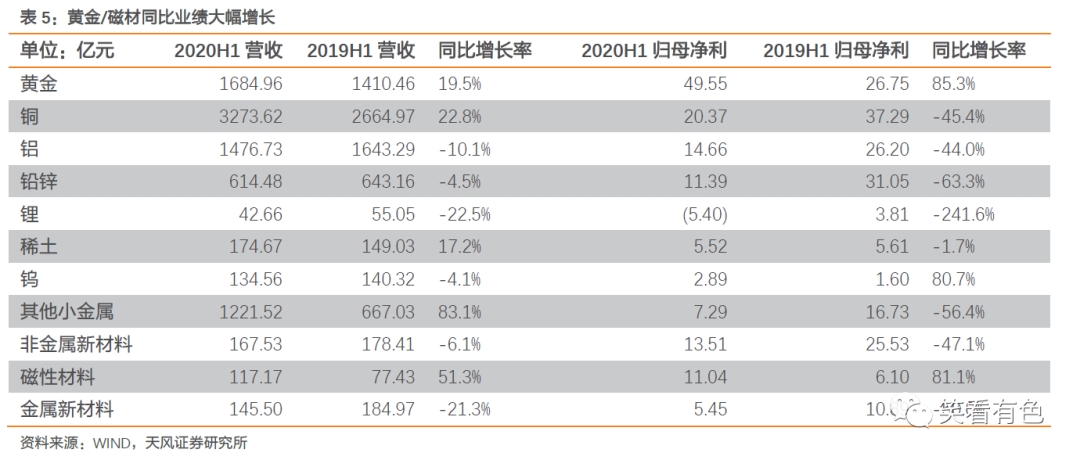 2020上半年,从中报业绩来看,黄金/磁材板块业绩同比增长分别达到85%/81%,基本金属和能源金属同期价格调整带来业绩下滑,从第二季度业绩来看,除锂外子版块实现环比修复。其中铜板块业绩环比实现涨幅达2213%,金属新材料、稀土、钨、磁材板块业绩环比增幅超过100%,