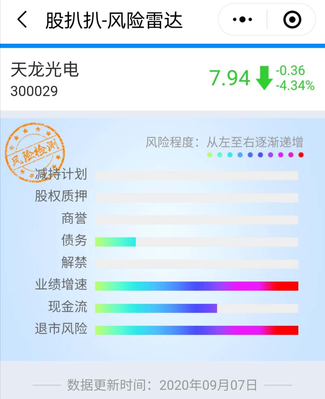 其实,对于个股风险,我们可以用专业的风险排除工具,股扒扒小程序来提前看一下。比如输入300029,就可以看到天龙光电相关信息。
