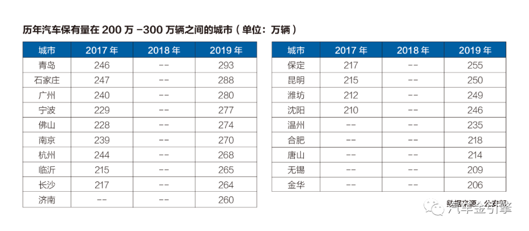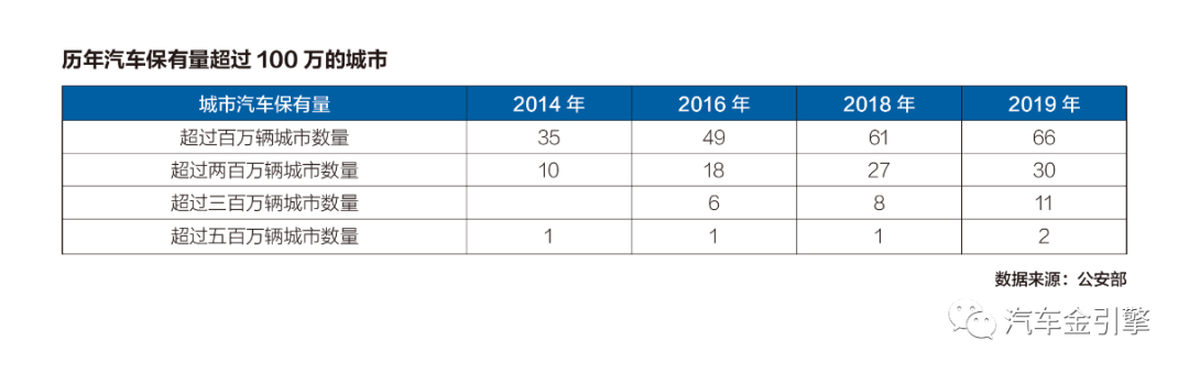 汽车保有量在200万-300万辆之间的城市有19个,全国总共有66个城市汽车保有量超过百万辆。