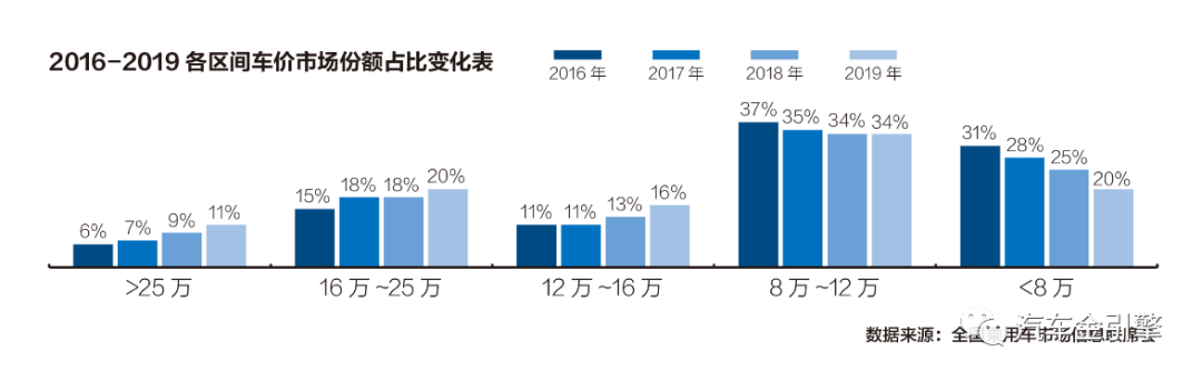 近几年中国车市的销售结构偏于高端化的特征,8万元以下车市市场份额剧烈下降,购买8~12万元车型的需求也小幅下降,12万元以上的总体需求相对增长较好,而25万元以上市场份额剧烈的增长。