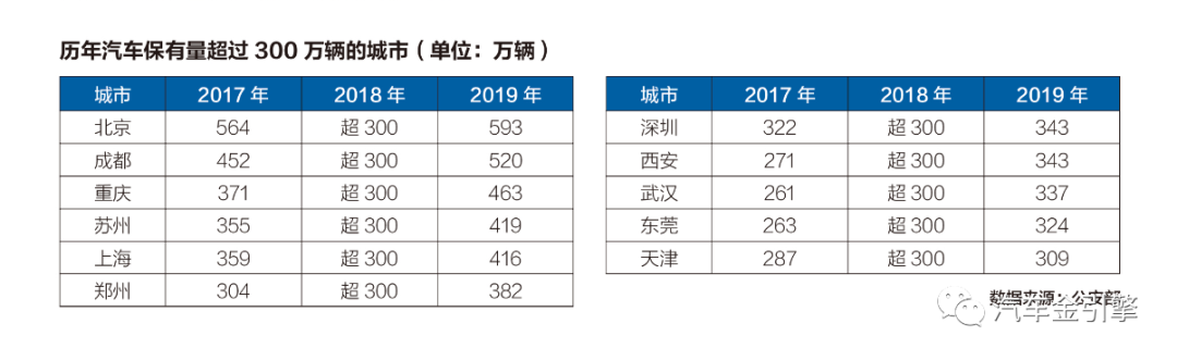 对比2018年,2019年汽车保有量超100万的城市增加了5个,超200万的城市增加了3个,超过300万的城市也增加了3个。