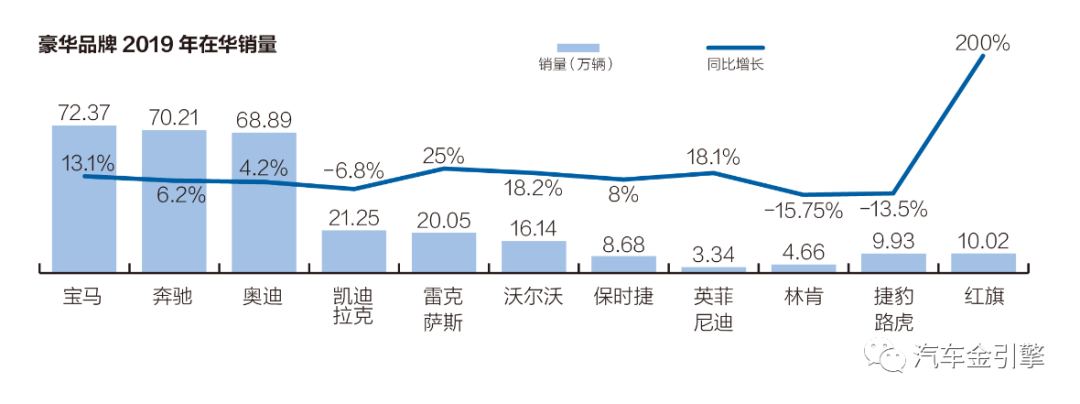 相对于整体车市的低迷,和低端车型的市场萎缩,2019年豪华品牌除了捷豹路虎全年销量下滑13.5%、林肯下滑15.75%、凯迪拉克下滑6.8%外,大部分主流豪华品牌都取得了喜人的成绩。