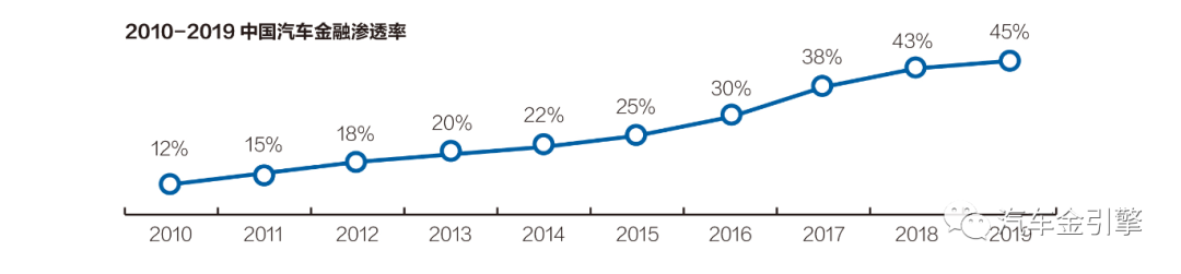 在汽车市场进入存量之争,并呈现消费分化、消费升级的同时,汽车金融被作为重要的促销利器和客户黏着剂而广受欢迎,汽车金融的渗透率也在不断攀升。据中国汽车金融实验室综合评测,2019年,中国汽车金融渗透率大约为45%。从品牌来看,豪华品牌渗透率较高,大部分渗透率在50%-55%之间,中国品牌和新能源车渗透率较低。从区域来看,华南、华东区域的渗透率最高,东北渗透率最低。