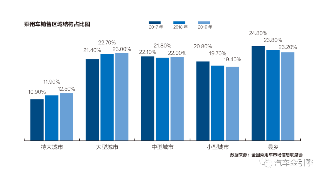 而这,与全国乘用车市场信息联席会秘书长崔东树提供的2019年全国乘用车销售区域结构数据相吻合,数据显示,2019年特大城市和大型城市的销售占比在加大,小型城市和县乡的占比在下滑,如特大城市的销售占比就由2017年的10.90%上升到12.50%,县乡占比由2017年的24.80%下降到2019年的32.20%。如下图: