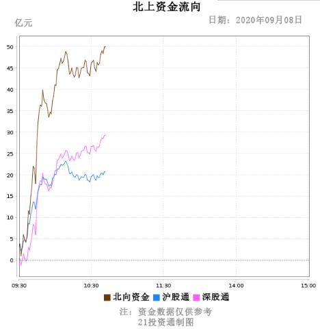 北向资金今日早盘持续流入,截至10:42分,已净流入超50亿元。其中,沪股通净流入20.67亿元,深股通净流入29.32亿元。