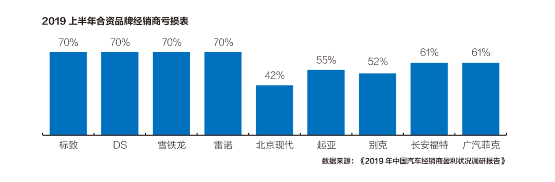 《2019年中国汽车经销商盈利状况调研报告》中显示,2019年上半年,豪华品牌经销商盈利最佳,合资品牌经销商盈利能力两极分化现象明显;自主品牌经销商盈利状况最为严峻,超过半数以上经销商亏损,仅有两成经销商盈利。