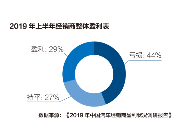 由乐车邦-远东宏信工业与装备事业部-汽车商业评论联合发布的《2019年中国汽车经销商盈利状况调研报告》显示,2019年上半年全国44%的汽车经销商呈现亏损状态,而盈利经销商占比仅为29%,总量不足9,000家。