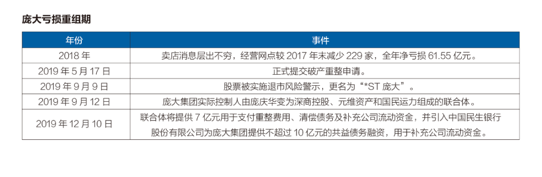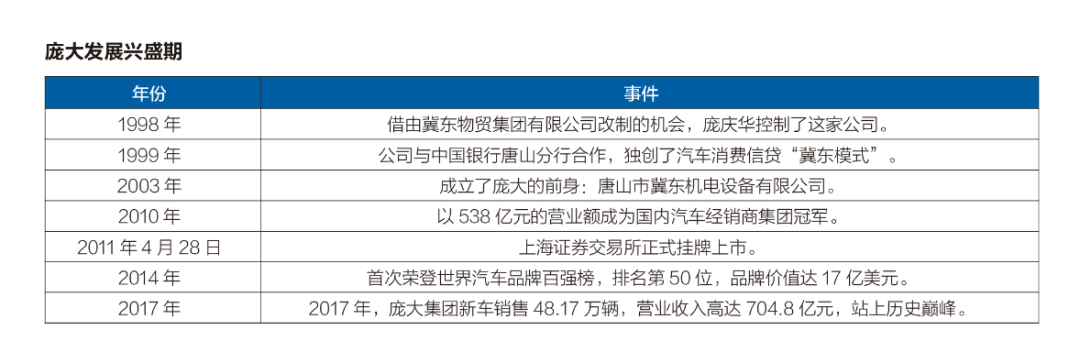2019年,相比润东汽车抛售经销店更加引人关注的是庞大集团的“破产重组”,庞大曾经于2009年以352亿元的营业收入,超越广汇汽车成为全国汽车经销商龙头企业;在2011年登陆资本市场,成为第一个以IPO方式登陆A股的纯汽销公司。但,这家经销商集团在车市寒冬中深陷困境,2017年被证监会调查,2019年5月17日提交“破产重组”申请。