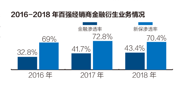 单车销售利润的下滑使得金融衍生产品发挥着越来越重要的作用。数据显示,2018年百强经销商集团汽车金融渗透率有所提升,但新车保险渗透率在下降,说明客户黏性不强。