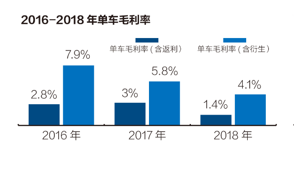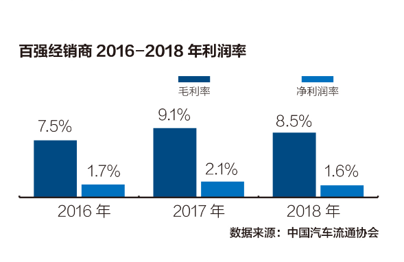 中国汽车流通协会公布的数据显示:2018年,经销商的盈利能力继续下降,含返利的单车毛利率以及含衍生的单车毛利率均大幅下滑,分别降至1.4%和4.1%。
