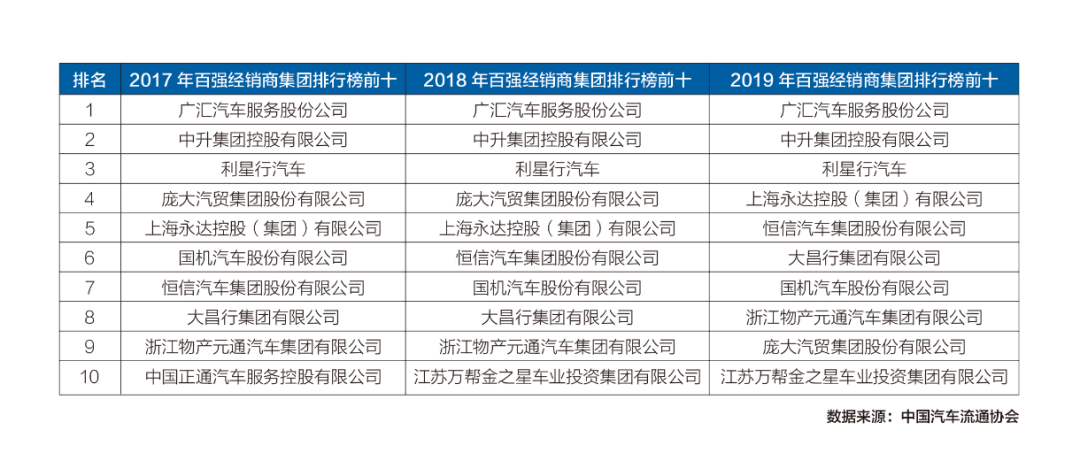 2019年6月6日,中国汽车流通协会公布了百强经销商集团排行榜(该排行榜以经销商集团们2018年的运营业绩为依据),百强排行榜前十的名单没有变化,但庞大集团对比上一年度排名下跌了5位,营业收入减少超过280亿元。此外,昔日排名第23位的润东汽车集团,没有出现在百强榜单中。润东汽车于2019年4月4日发布公告,拟以人民币34亿元出售56家汽车经销店,该经销商集团2014年8月12日在香港联交所主板成功上市。