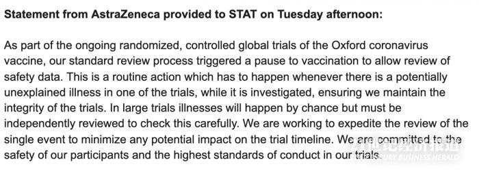阿斯利康在在一份回复给STAT的声明中说,该公司的“标准审查程序触发了疫苗接种的暂停,以允许审查安全数据。”并启动了研究搁置。“在一项试验中,只要其中一项试验可能存在无法解释的疾病,就必须采取常规行动,以确保我们保持试验的完整性。我们正在努力加快对单一事件的审查,以最大程度地减少对审判时间表的潜在影响。”