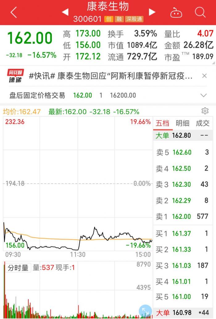 受此消息影响,康泰生物盘中一度下挫达19.66%,触及跌停,截至当日收盘,跌幅16.57%。
