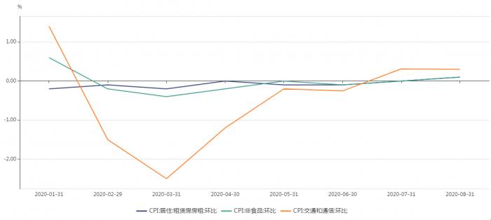 刨除食品和能源的核心CPI,8月同比涨幅仍然处于0.5%的历史低位,但环比上涨0.1%,为今年2月以来的首次。与之类似的还有非食品CPI,8月非食品CPI同比上涨0.1%,但环比上涨0.1%,为今年2月以来的首次。
