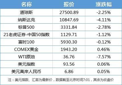 欧洲主要股市因科技股下挫拖累集体收跌;21老虎证券-中国50指数收报1129.71点跌1.12%。黄金收盘微涨,创一周新高;原油重挫,创近三个月新低。