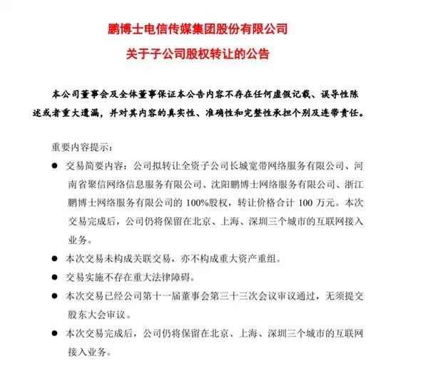 当时,市场猜测长城宽带或将退出宽带市场。对此,鹏博士否认长城宽带将退出宽带市场:长城宽带将继续为用户提供互联网接入服务和其他电信增值业务。