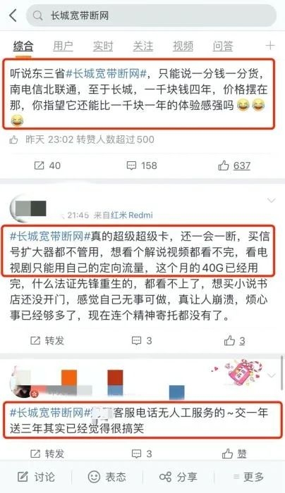 近日,“长城宽带100万元打包转让”消息出来后,不少网友就纷纷吐槽:“网速很一般……服务更差”,“有跟我一样,用完之后 网络还不如4G的吗”,“没3G快呢!”“没3G快有点尬黑,不过长城延迟是真的高。”