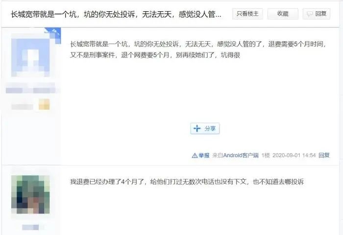 长城宽带贴吧里,有广州用户投诉遭遇断网38天,有杭州用户则遭遇断网长达两个月。“销户退费还特麻烦,退费经常要花上四五个月时间。”“又不是刑事案件,退个网费要五个月?”