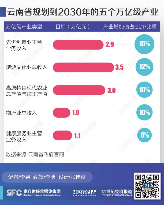 21世纪经济报道记者注意到,在云南的万亿级产业中,先进制造业最受推崇,到2030年其主营业务收入计划达到2.9万亿元,占GDP比重达到15%。
