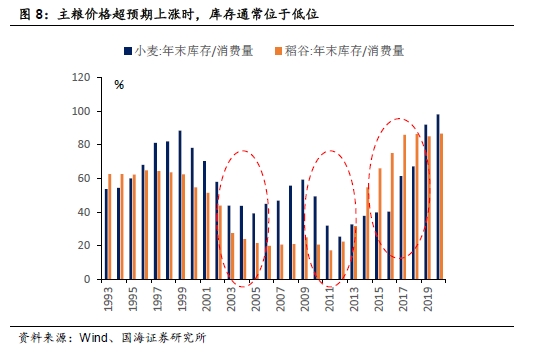 虽然PPI上行会引发粮食价格的上涨,但其上涨幅度,还取决于政府平抑价格波动的能力,即主粮库存。主粮库存均处于历史低位时,政府平抑价格波动的能力有限,粮商囤积行为会放大粮食上涨幅度(2003、2009)。主粮库存高企时,政府有能力控制粮食价格,主粮价格超预期上涨的可能性很小(2017年)。