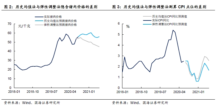 假设猪肉价格在中秋节前的9月达到周期性高点60元/千克,此后逐步回落。2021年春节后,猪肉价格回落至50元/千克,年中回落至45元/千克。根据计算,2021年春节后CPI依旧延续上行趋势,但在2021年5月份阶段性高点,CPI同比为2.3%,较历史均值法计算结果低0.7个百分点。(若猪价回落至50元/千克,对应5月CPI为2.6%)