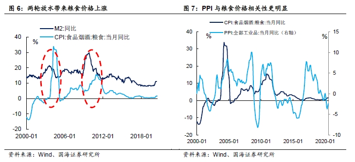 从主粮涨价的路径来看,历史上货币宽松、或者M2的上行,一定程度与后续粮食价格的上涨有相关性。但粮食价格上涨的根本原因,还是在于PPI的上行,并抬升主粮的种植成本(种子、农机使用、化肥等),因此数据上PPI与粮食价格的正相关性更加明显。