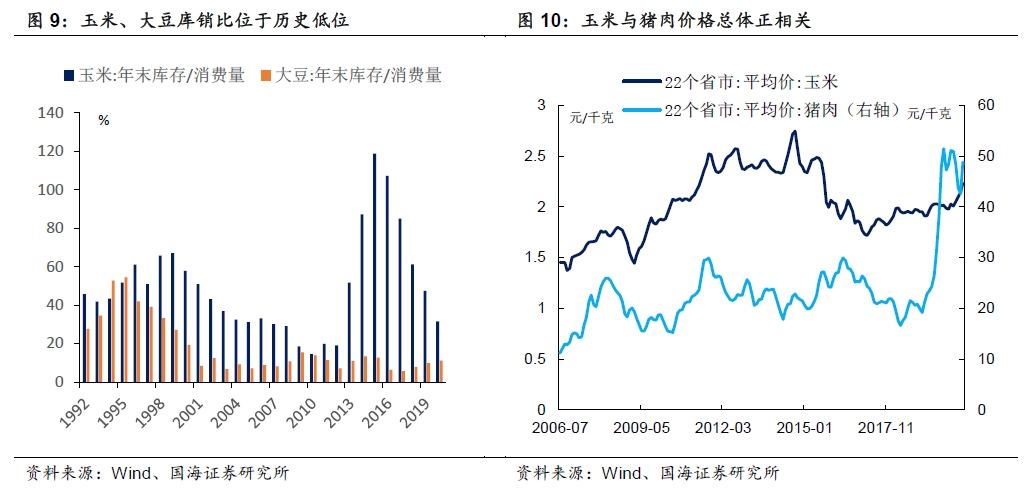 从饲料粮涨价的路径来看,当前玉米、大豆等饲料粮库存位于历史低位,的确存在超预期上涨的可能性。饲料粮涨价,理论上可以通过提高生猪养殖成本,向CPI猪肉项传导。
