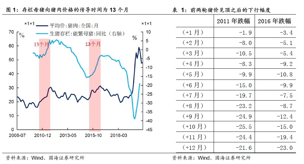 从前两轮猪周期来看,从能繁母猪存栏量增速拐点传导至生猪价格顶点,时间大约在13个月(生猪存栏为9个月)。本轮猪周期中,能繁母猪存栏拐点出现2019年9月,因此合理判断本轮猪肉价格顶点出现在中秋节前后的9至10月份。