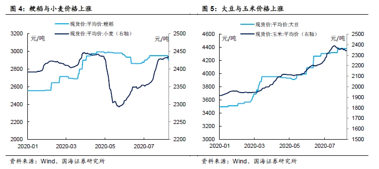 疫情及南方大雨之后,小麦、粳稻等主粮与大豆、玉米等饲料粮价格均出现了一定程度的上涨,引发了市场对于粮食通胀超预期的担忧。