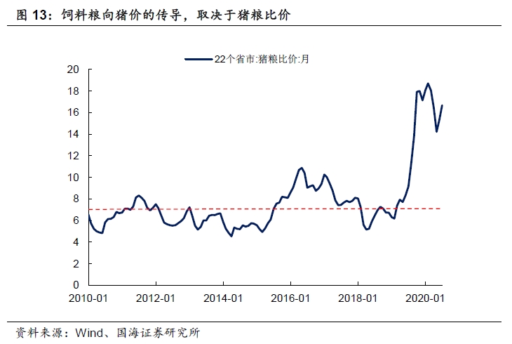 但在另一方面,从饲料粮向猪价的传导,仍需分情况讨论。理论上猪粮比位于高位时,生猪养殖利润会部分吸收饲料粮价格上涨带来的冲击,导致饲料粮价格向猪肉价格的传导不畅。