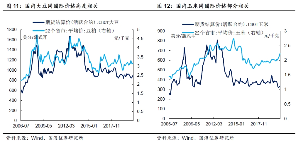 相较于主粮,我国大豆80%以上依靠进口,玉米市场化定价后,其价格走势也与外盘也较为相关。当前国际地缘政治动荡,极端天气风险频发,大豆、玉米国内外价格超预期上涨的风险较大。
