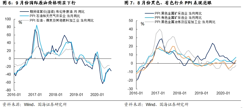 PPI方面,8月份国际原油价格环比继续上行,带动石油相关产业PPI持续改善。但进入9月份后,国际原油价格明显回调,将打断持续6月份以来石油相关产业PPI的回暖势头。