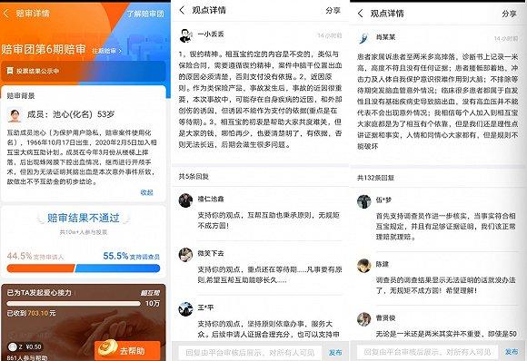 2020年8月第二期,在一个理赔争议案件中,有超过10万名“赔”审员参与投票,并就该互助成员是否应该获得赔偿,展开激烈的观点碰撞。最终以“44.5%支持申请人,55.5%支持调查员”的结果“裁定”:赔审结果不通过。