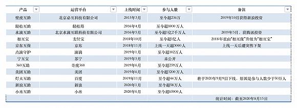 据统计,截至2020年8月,已经至少有12家互联网公司在运营互助保障产品,参与人数从数十万到千万不等。