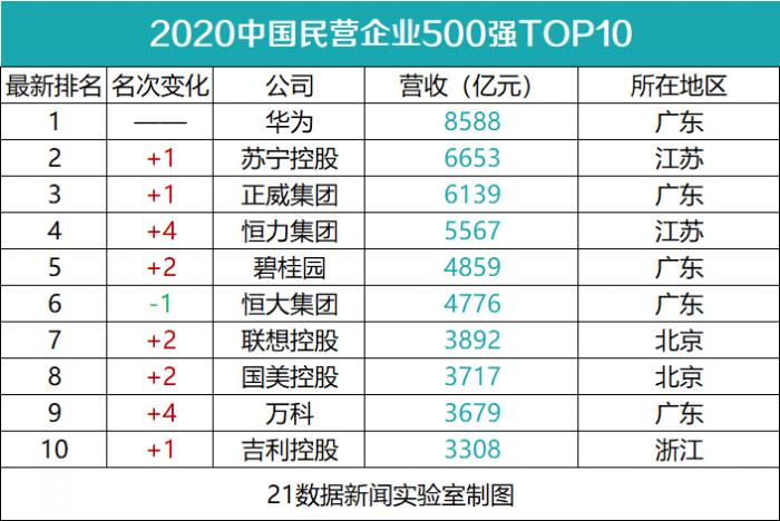 9月10日,全国工商联发布2020中国民营企业500强榜单。榜单显示,华为蝉联第一,苏宁控股、正威集团位列二三名。中国民企500强究竟“强”在哪儿?哪个省份上榜企业最多?一起来看看!