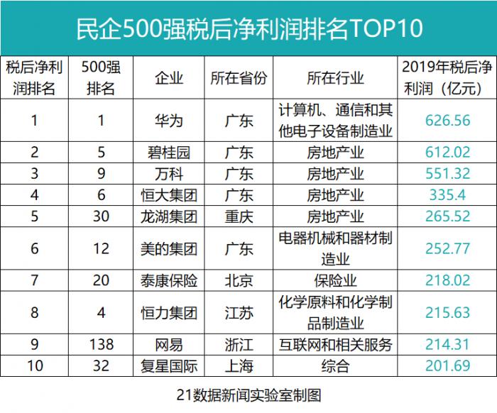 此外,税后净利润最高的前10企业中,房地产企业占了4位。