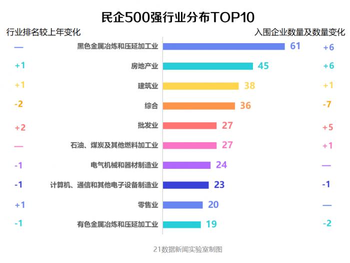 前十大行业中,黑色金属冶炼和压延加工业继续位列第一,且入围企业数量呈持续上涨趋势,较上年增加6家。而综合则从上年的第二位跌至第四位,入围企业数量减少了7家。