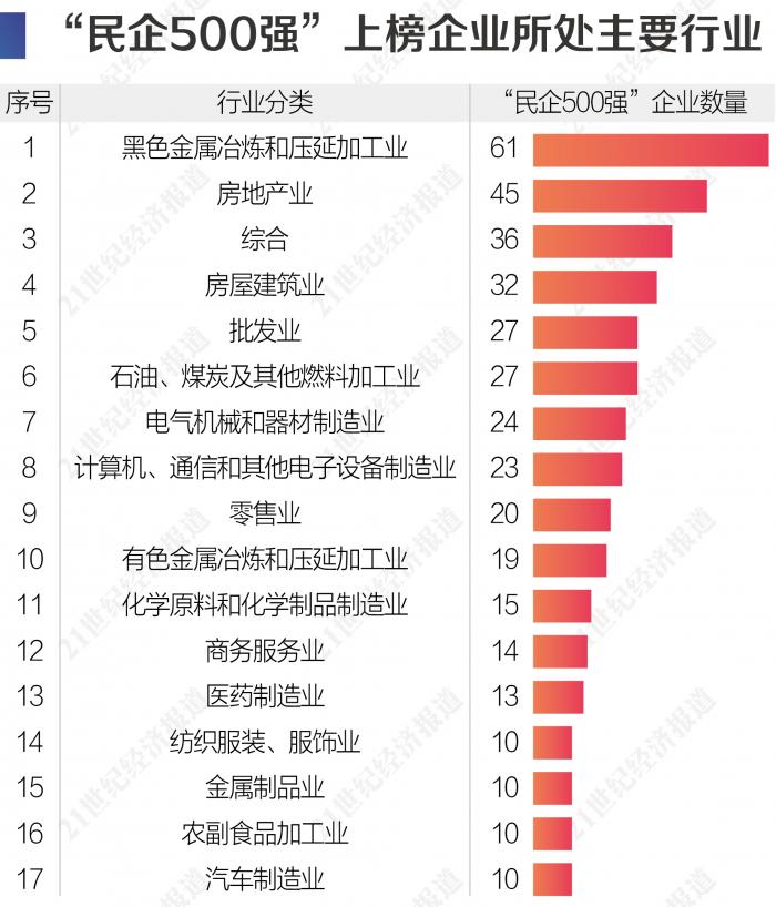民营企业500强前十大行业共包含320家企业,比上年增加8家,黑色金属冶炼和压延加工业、房地产业、综合、建筑业位居前四位。