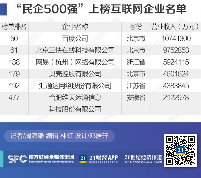 6家互联网服务企业上榜,包括百度、美团、网易、贝壳、汇通达、维天运通。
