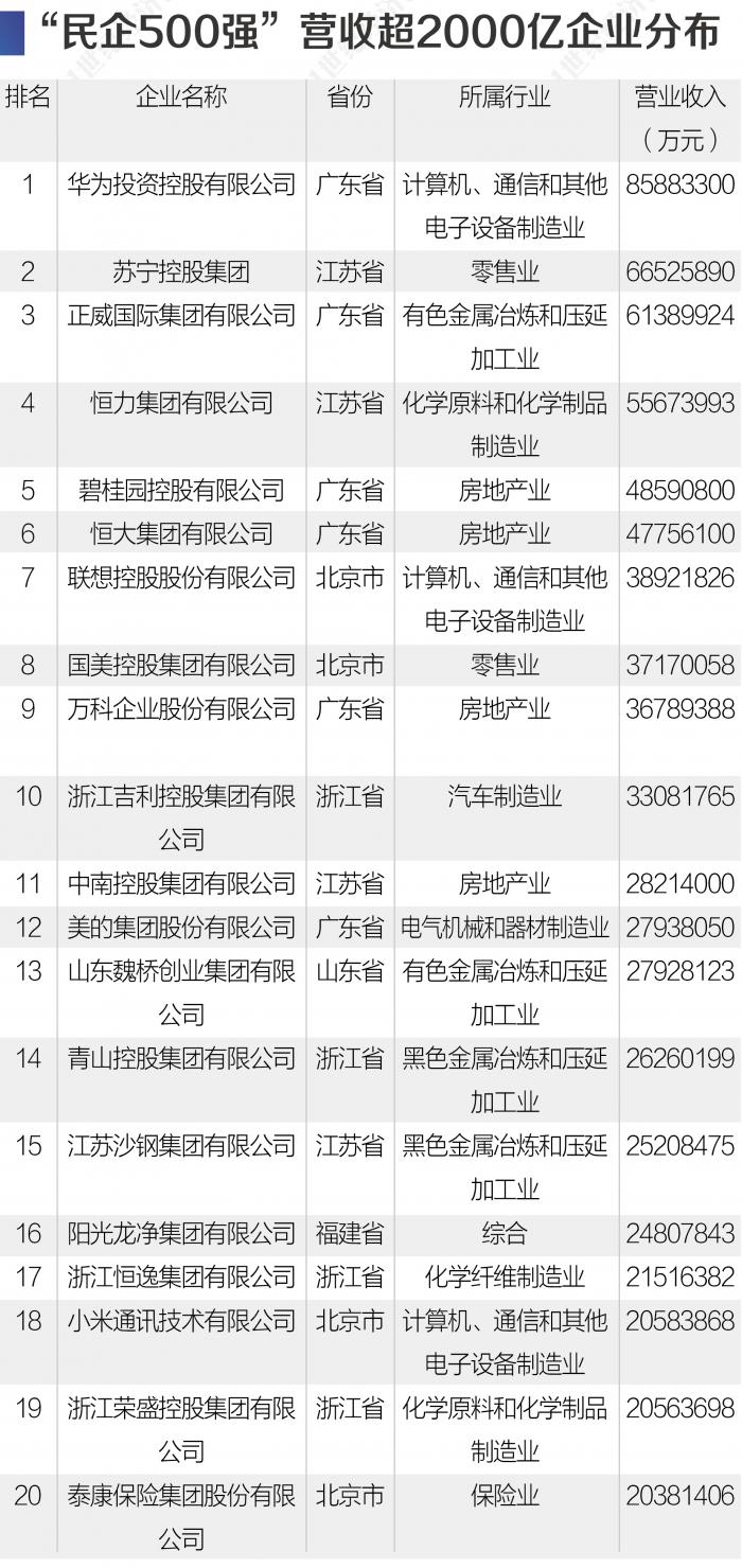 具体而言,广东有6家前20强民企,江苏、北京、浙江各有4家企业,山东、福建各有1家企业。