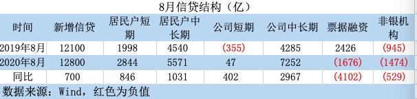 8月新增贷款1.28万亿,同比多增700亿,主要受公司中长期贷款多增影响。