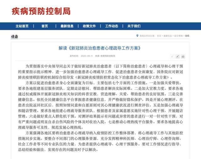 为贯彻落实中央领导同志关于做好新冠肺炎治愈患者(以下简称治愈患者)心理疏导和心理干预的重要指示批示精神,进一步加强治愈患者心理疏导工作,促进治愈患者全面康复,国务院应对新冠肺炎疫情联防联控机制综合组印发《新冠肺炎疫情防控常态化下治愈患者心理疏导工作方案》。