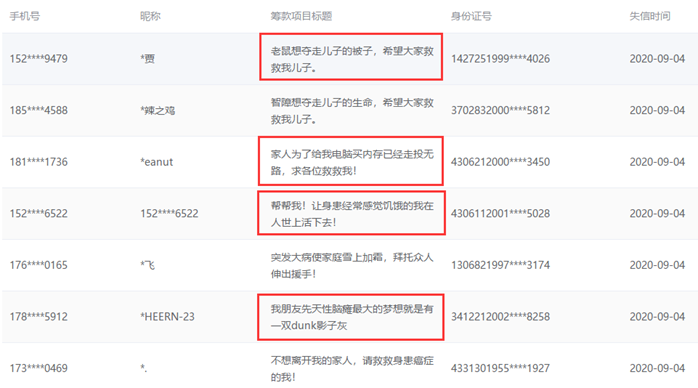 水滴筹9月4日公示的黑名单,失信项目标题包括“老鼠想夺走儿子的被子,希望大家救救我儿子”、“帮帮我!让身患经常感觉饥饿的我在人世上活下去”。