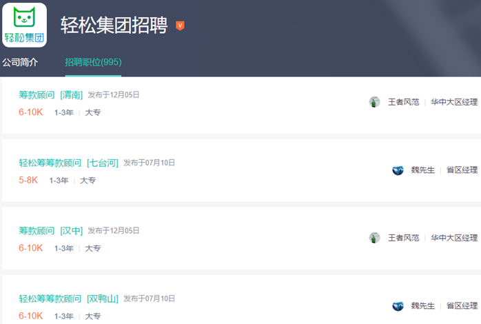 开甲财经还注意到,轻松筹、水滴筹均在BOSS直聘大量招聘“筹款顾问”其中,轻松筹正在渭南、七台河、汉中、双鸭山、北京、上海、武汉、苏州、中山、南通、揭阳、徐州、宜昌、泰州、曲靖、乌海、达州、盘锦等地均在招聘“筹款顾问”职位。