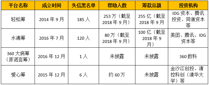 截至发稿前,轻松筹公示的失信黑名单共185人,公示起始时间为2018年7月20日。水滴筹公示的失信黑名单共122人,公示起始时间为2017年7月30日。爱心筹公示的失信黑名单共6人,公示起始时间为2018年6月21日(2018年12月18日停止公示)。360大病筹公示的失信黑名单共1人,公示起始时间为2020年1月23日。